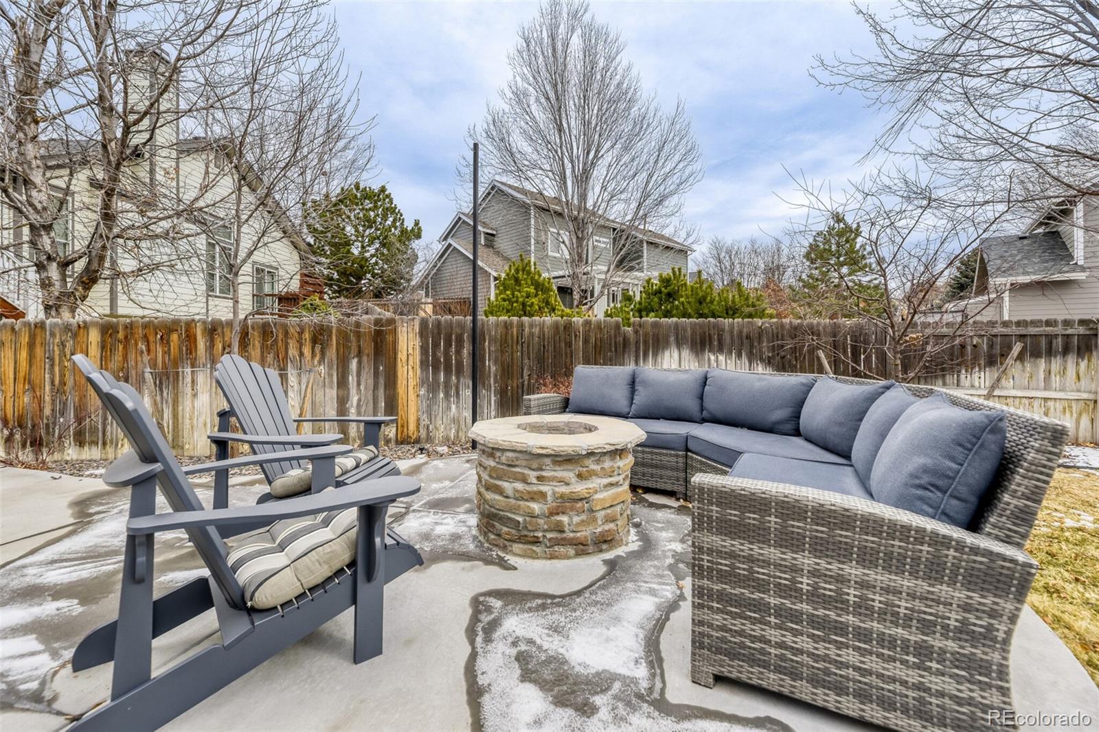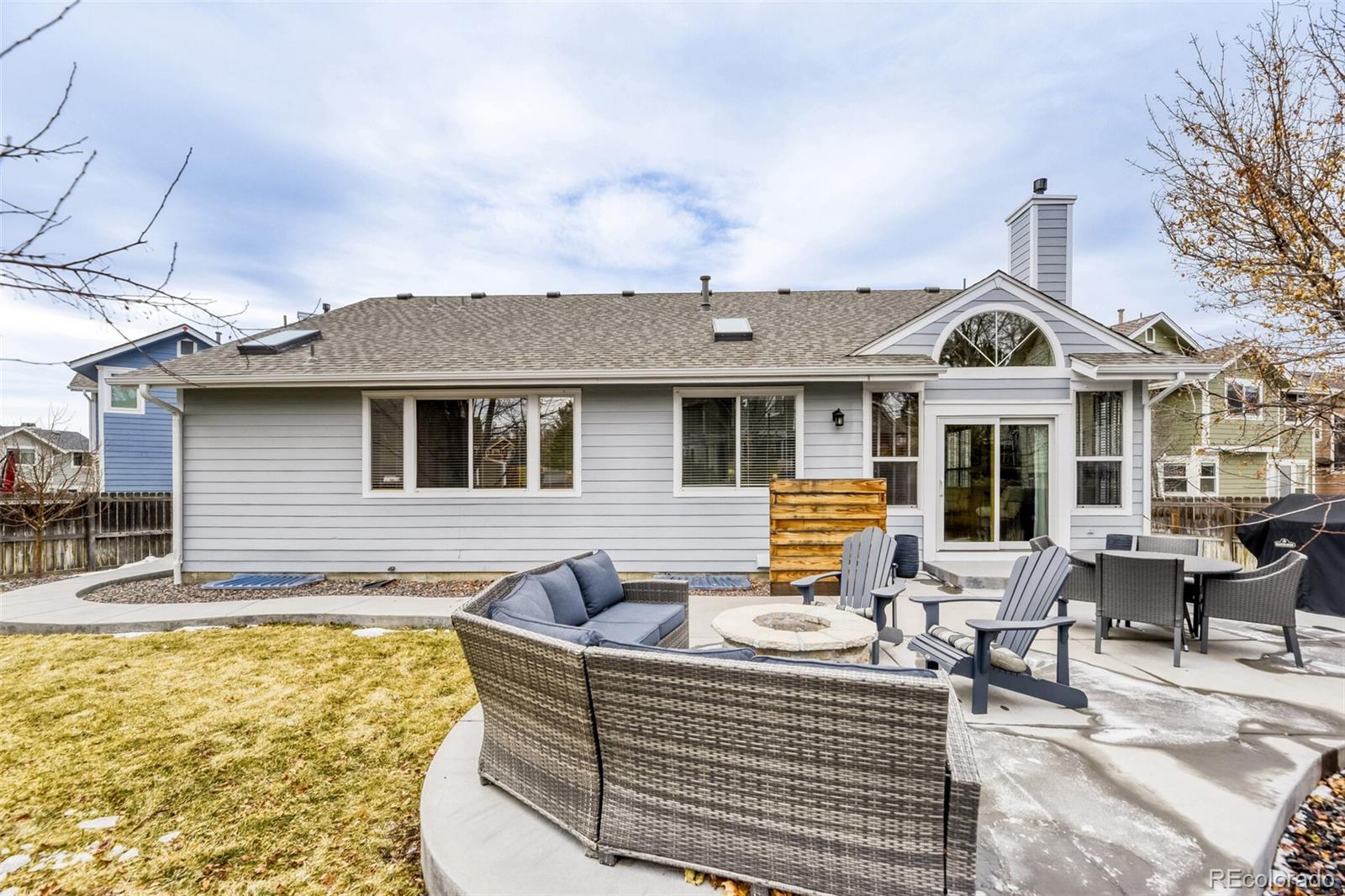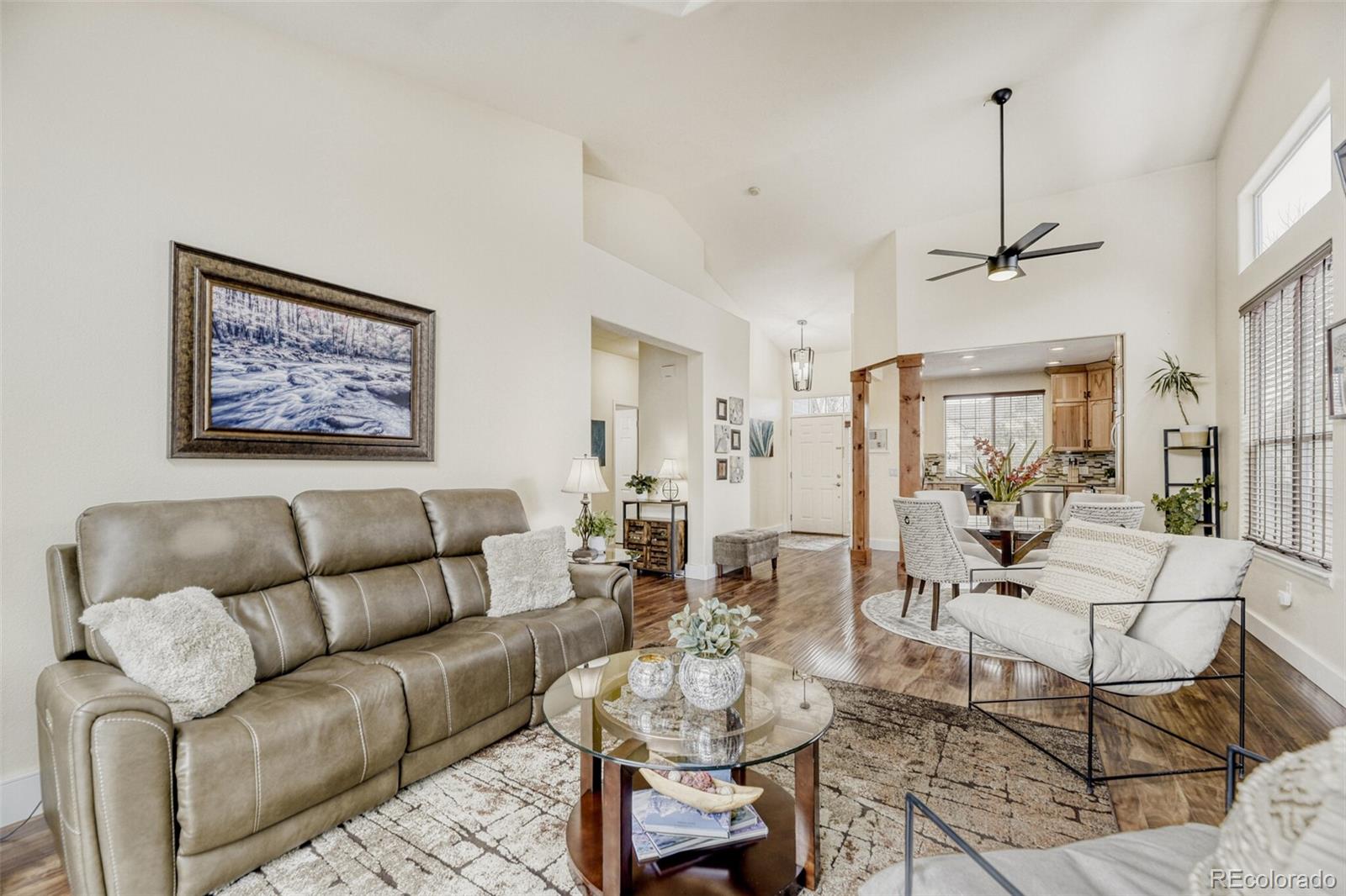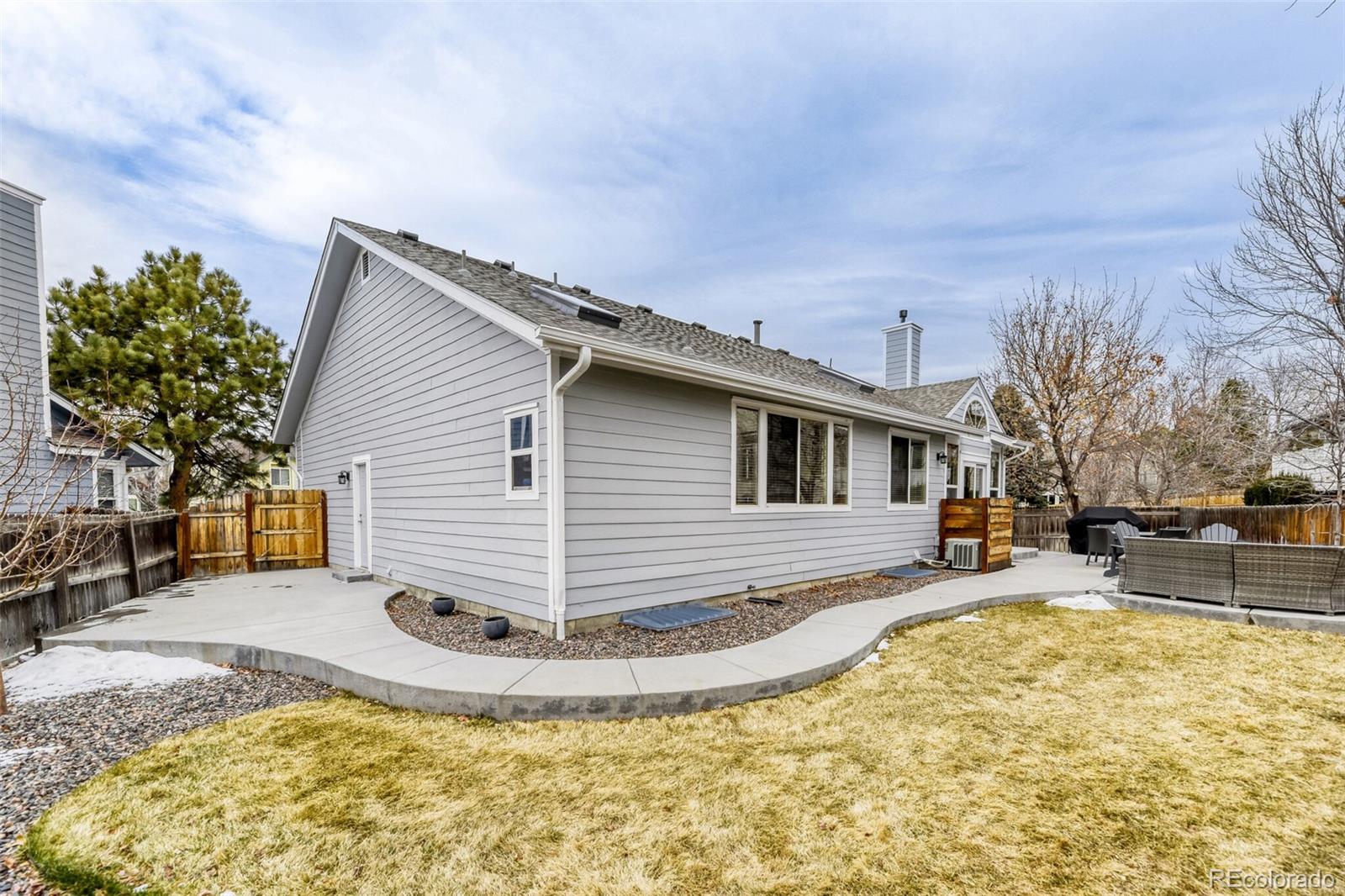 Beautifully updated ranch tucked on an oversized cul-de-sac lot framed by mature trees and lush landscaping. From the moment you step inside, you're greeted by seamless wood flooring, soaring vaulted ceilings, and abundant windows that flood the home with warm, natural light. At the heart of the home is a stunning mountain-modern kitchen, completely remodeled with floor-to-ceiling hickory cabinetry, quartz countertops, a stylish glass tile backsplash, a generous farmhouse sink, and stainless steel appliances. The kitchen has been thoughtfully opened to create an effortless open-concept layout--ideal for everyday living and easy entertaining. A bright dining area flows directly into the inviting great room featuring vaulted ceilings, built-in bookshelves, and a cozy stone fireplace--the perfect place to unwind. Down the hall, you'll find three bedrooms, including a front bedroom currently styled as a private home office with French doors. A spacious guest bedroom sits beside an updated secondary bath with a custom vanity and fresh tile shower surround. The peaceful primary suite offers vaulted ceilings, an ample walk-in closet, and a beautifully updated en-suite bath with a custom dual-sink vanity and a gorgeous oversized glass walk-in shower. Step outside to an equally impressive backyard designed for Colorado living--highlighted by a huge custom patio with a built-in stone firepit, plus an extended walkway that wraps to a second side patio with convenient access to the garage via an exterior service door. With a generous yard for kids and pets and professional landscaping throughout, this outdoor space is ready for summer nights and weekend gatherings.An unfinished basement provides tons of storage today and exciting potential for future expansion--home gym, rec room, additional bedrooms--your choice. Brand New Roof, Newer Furnace, Newer water heater, newer patio and driveway, some windows replaced.