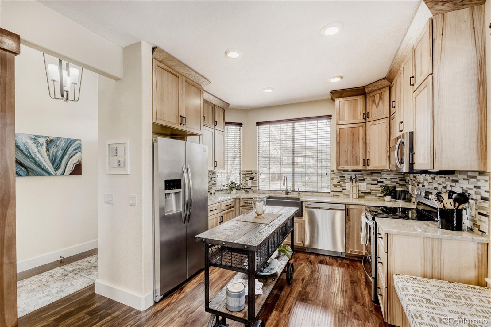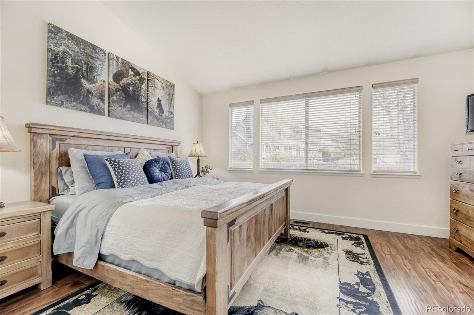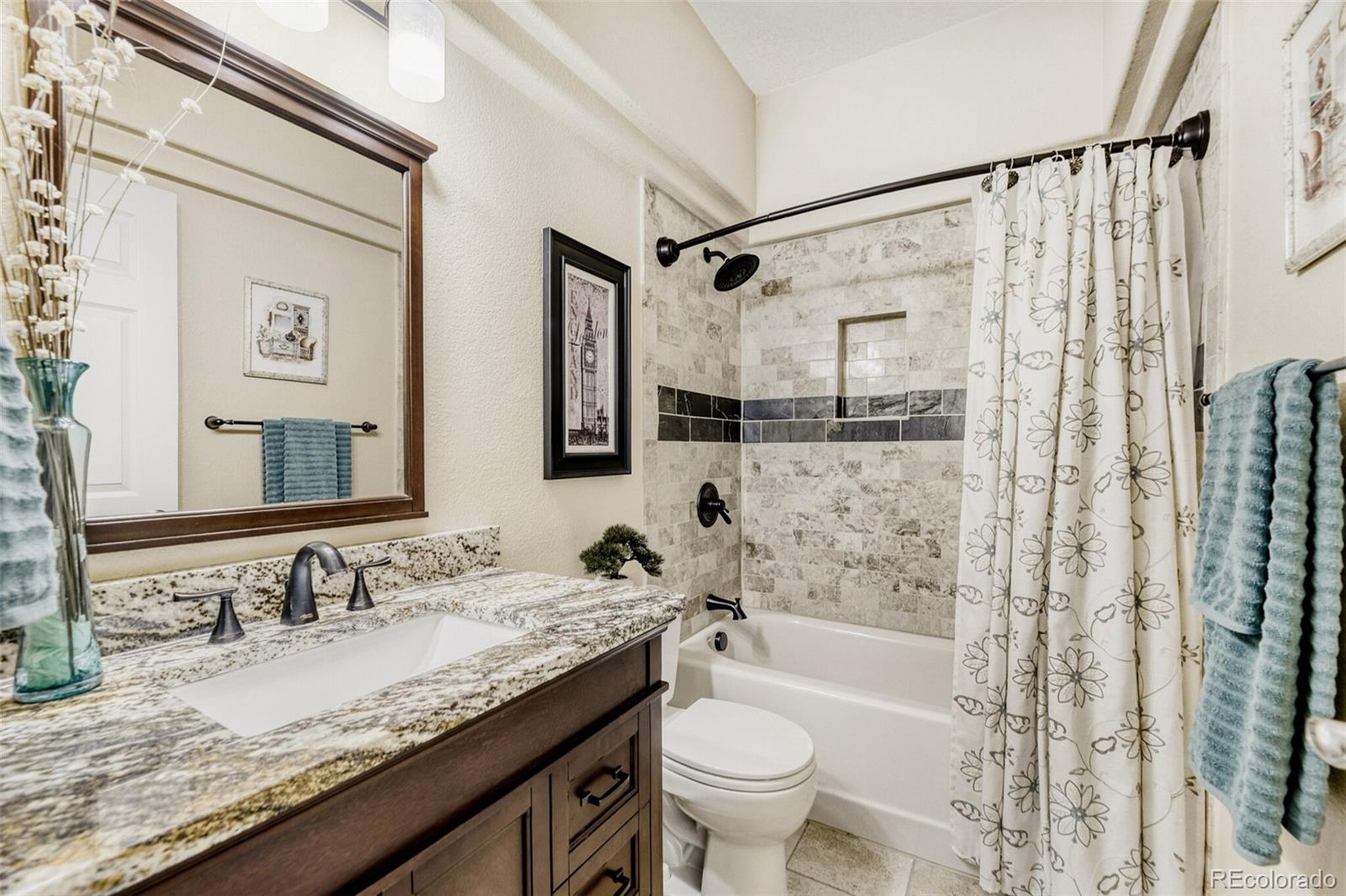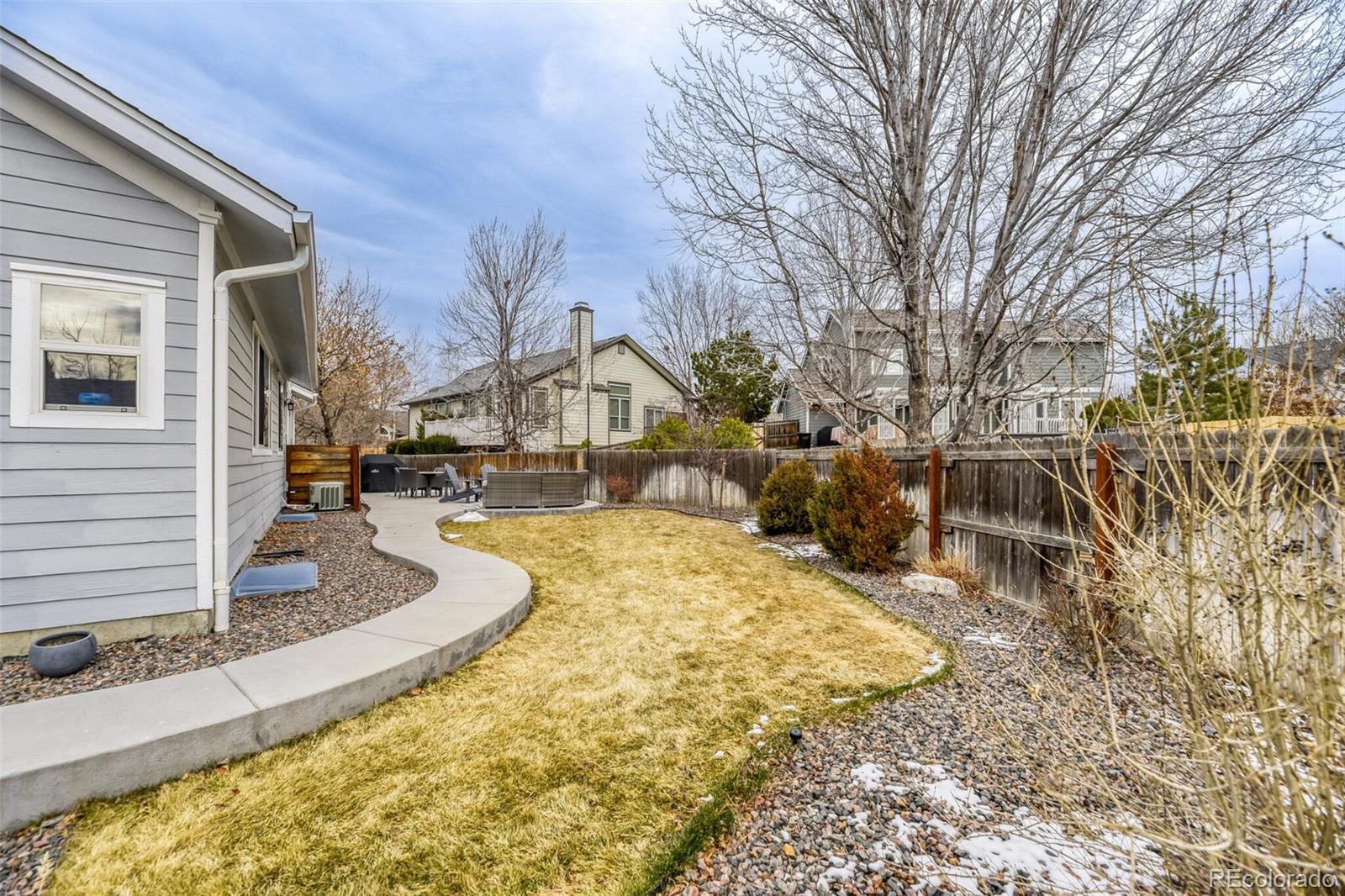 Beautifully updated ranch tucked on an oversized cul-de-sac lot framed by mature trees and lush landscaping. From the moment you step inside, you're greeted by seamless wood flooring, soaring vaulted ceilings, and abundant windows that flood the home with warm, natural light. At the heart of the home is a stunning mountain-modern kitchen, completely remodeled with floor-to-ceiling hickory cabinetry, quartz countertops, a stylish glass tile backsplash, a generous farmhouse sink, and stainless steel appliances. The kitchen has been thoughtfully opened to create an effortless open-concept layout--ideal for everyday living and easy entertaining. A bright dining area flows directly into the inviting great room featuring vaulted ceilings, built-in bookshelves, and a cozy stone fireplace--the perfect place to unwind. Down the hall, you'll find three bedrooms, including a front bedroom currently styled as a private home office with French doors. A spacious guest bedroom sits beside an updated secondary bath with a custom vanity and fresh tile shower surround. The peaceful primary suite offers vaulted ceilings, an ample walk-in closet, and a beautifully updated en-suite bath with a custom dual-sink vanity and a gorgeous oversized glass walk-in shower. Step outside to an equally impressive backyard designed for Colorado living--highlighted by a huge custom patio with a built-in stone firepit, plus an extended walkway that wraps to a second side patio with convenient access to the garage via an exterior service door. With a generous yard for kids and pets and professional landscaping throughout, this outdoor space is ready for summer nights and weekend gatherings.An unfinished basement provides tons of storage today and exciting potential for future expansion--home gym, rec room, additional bedrooms--your choice. Brand New Roof, Newer Furnace, Newer water heater, newer patio and driveway, some windows replaced.