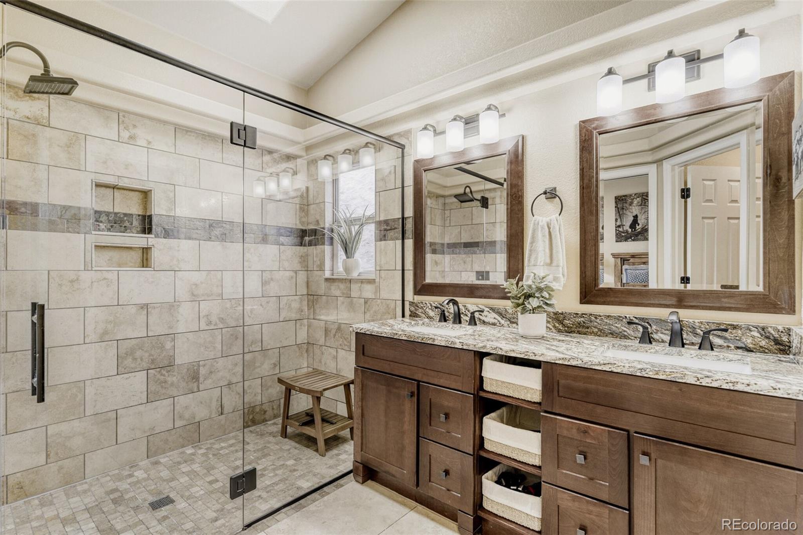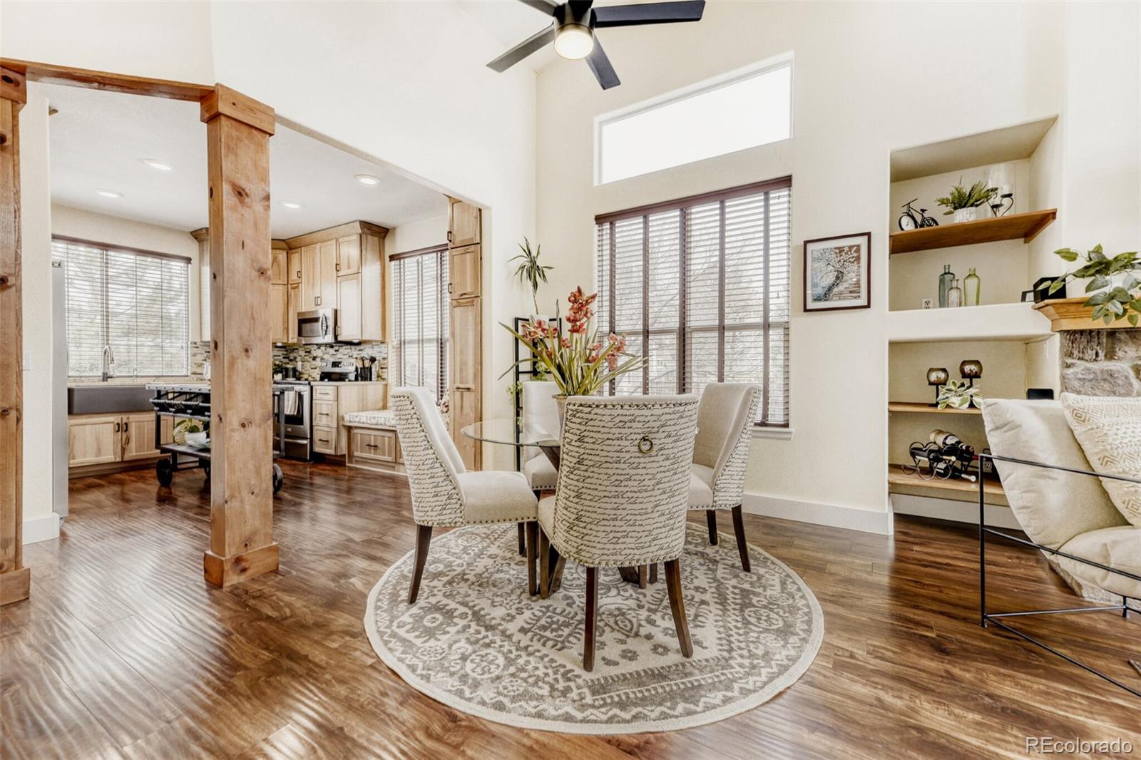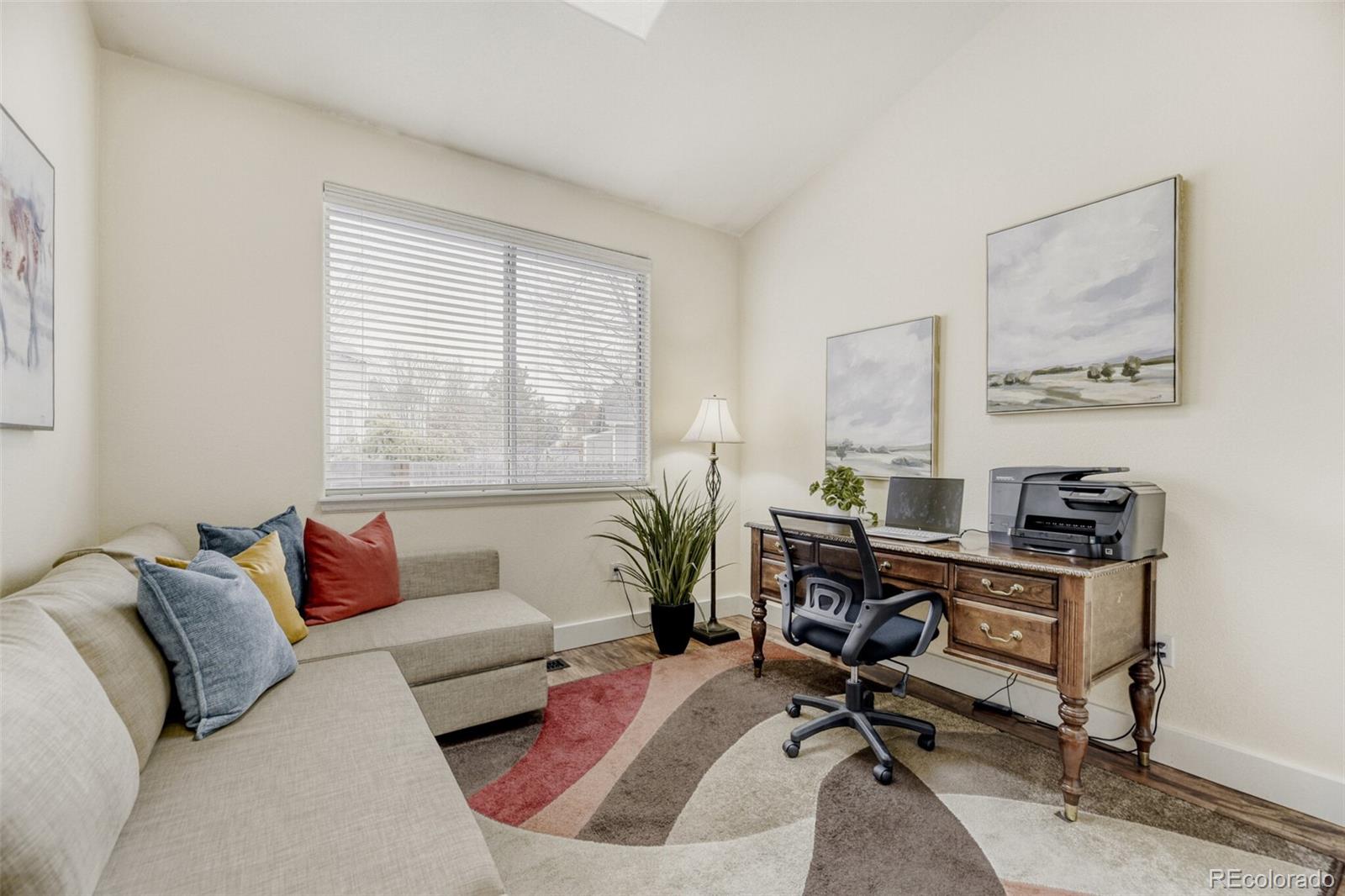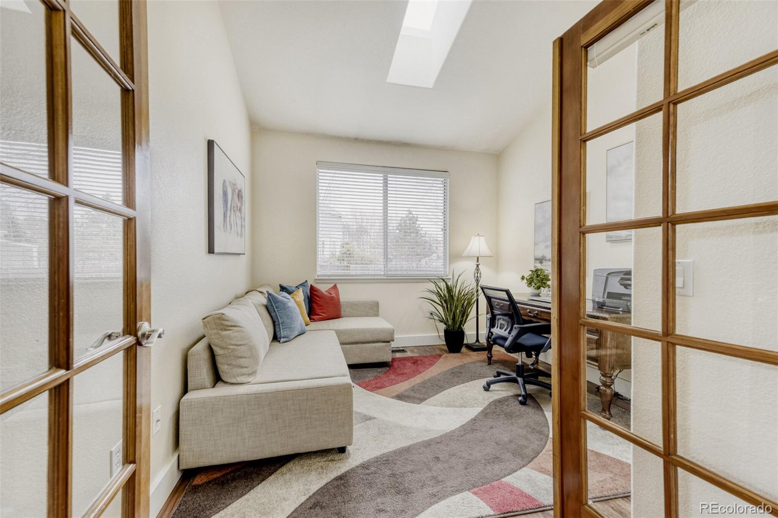 Beautifully updated ranch tucked on an oversized cul-de-sac lot framed by mature trees and lush landscaping. From the moment you step inside, you're greeted by seamless wood flooring, soaring vaulted ceilings, and abundant windows that flood the home with warm, natural light. At the heart of the home is a stunning mountain-modern kitchen, completely remodeled with floor-to-ceiling hickory cabinetry, quartz countertops, a stylish glass tile backsplash, a generous farmhouse sink, and stainless steel appliances. The kitchen has been thoughtfully opened to create an effortless open-concept layout--ideal for everyday living and easy entertaining. A bright dining area flows directly into the inviting great room featuring vaulted ceilings, built-in bookshelves, and a cozy stone fireplace--the perfect place to unwind. Down the hall, you'll find three bedrooms, including a front bedroom currently styled as a private home office with French doors. A spacious guest bedroom sits beside an updated secondary bath with a custom vanity and fresh tile shower surround. The peaceful primary suite offers vaulted ceilings, an ample walk-in closet, and a beautifully updated en-suite bath with a custom dual-sink vanity and a gorgeous oversized glass walk-in shower. Step outside to an equally impressive backyard designed for Colorado living--highlighted by a huge custom patio with a built-in stone firepit, plus an extended walkway that wraps to a second side patio with convenient access to the garage via an exterior service door. With a generous yard for kids and pets and professional landscaping throughout, this outdoor space is ready for summer nights and weekend gatherings.An unfinished basement provides tons of storage today and exciting potential for future expansion--home gym, rec room, additional bedrooms--your choice. Brand New Roof, Newer Furnace, Newer water heater, newer patio and driveway, some windows replaced.